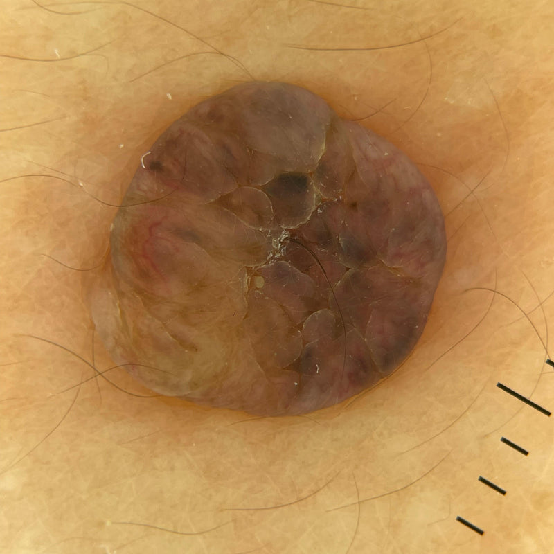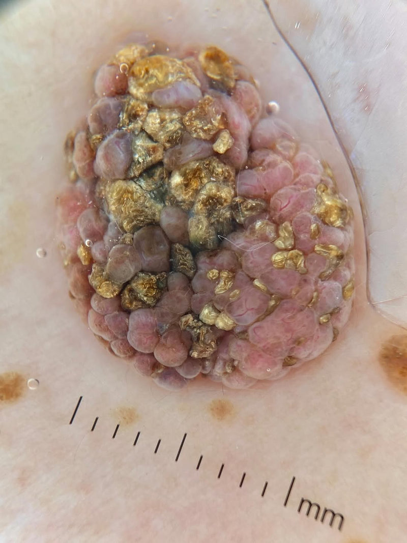 - Vascular Morphology: Basal cell carcinomas display arborizing vessels, distinct from the dotted vessels in squamous cell carcinomas.